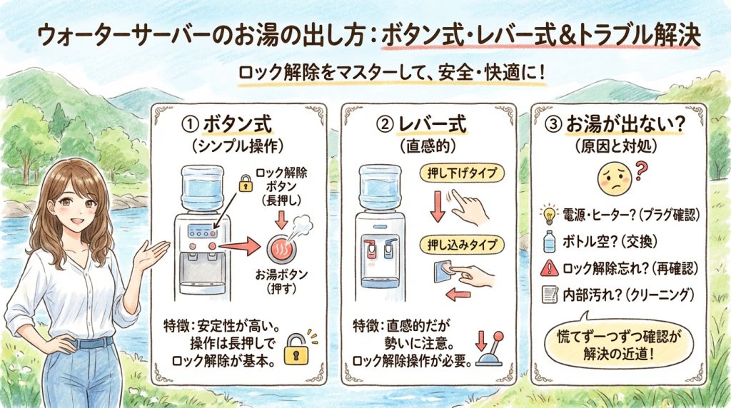 ウォーターサーバーのお湯は安全ロック付きの構造で、正しい手順を一度覚えてしまえば簡単に出すことができます。この記事では、ボタン式・レバー式の違いを踏まえながら、お湯を安全に出す正しい方法を詳しく解説します。